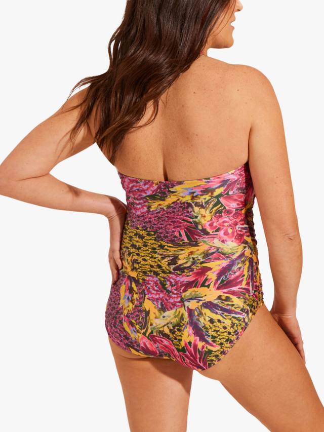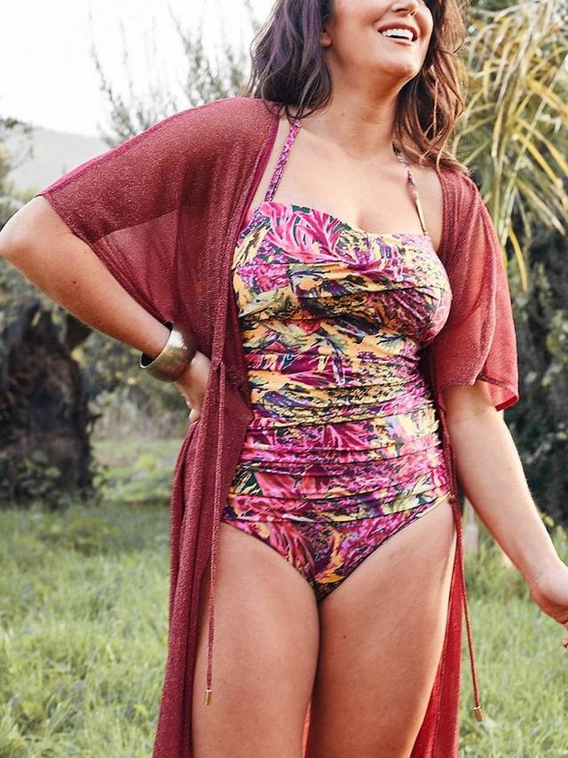 Этот купальник стандартной длины имеет драпированный крой и присборенные бока для элегантной посадки. Бретелька-халтер регулируется, а нескользящая полоска фиксирует купальник на месте, если вы решите снять его и получить бандо. Подушечки для груди фиксированные, но мягкие для комфорта, и вы будете выделяться на солнце благодаря яркому тропическому принту.