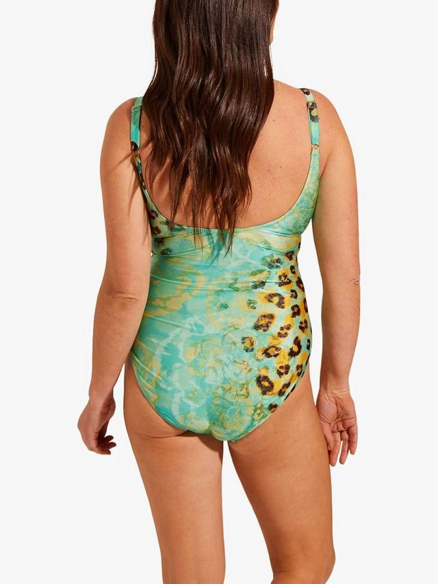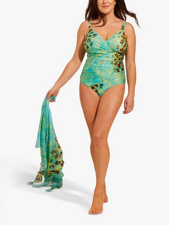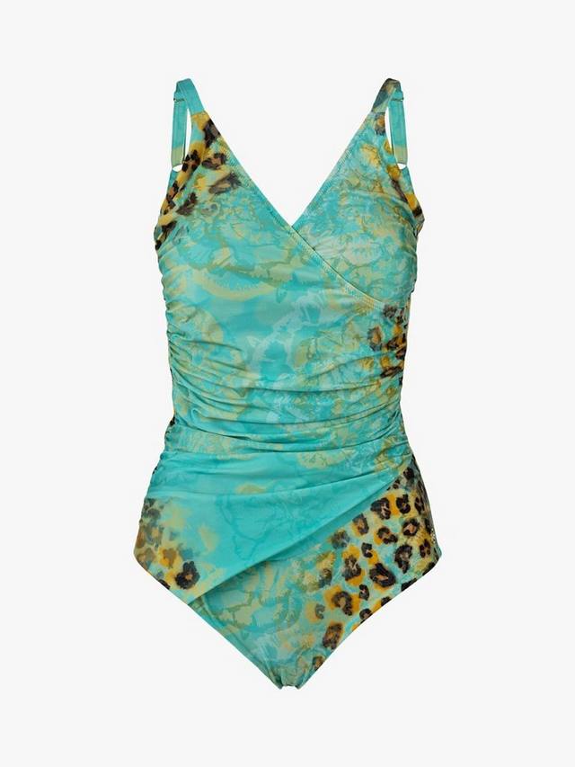 Имитация купальника-обертывания с привлекающим внимание анималистичным принтом.