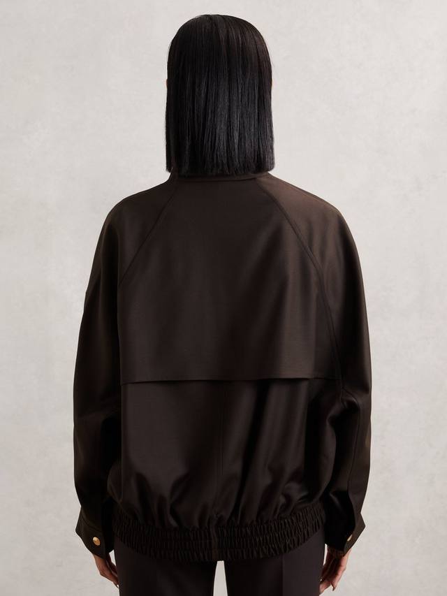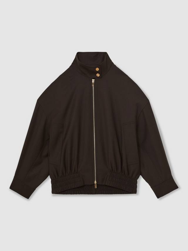 Войдите в любую комнату с уверенностью в этой шерстяной куртке-бомбере. Приталенный крой, воротник-труба и длинные рукава сочетают в себе элегантный стиль и повседневный комфорт, помогая вам чувствовать себя непринужденно и быть готовыми к любым переменам.