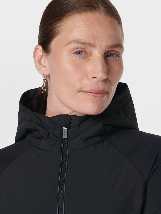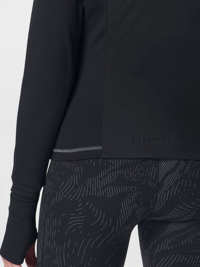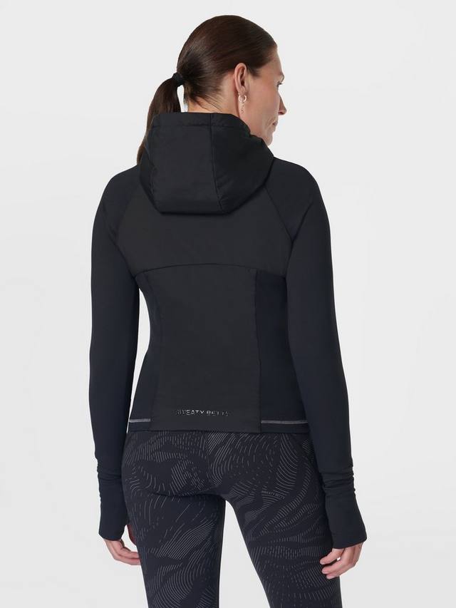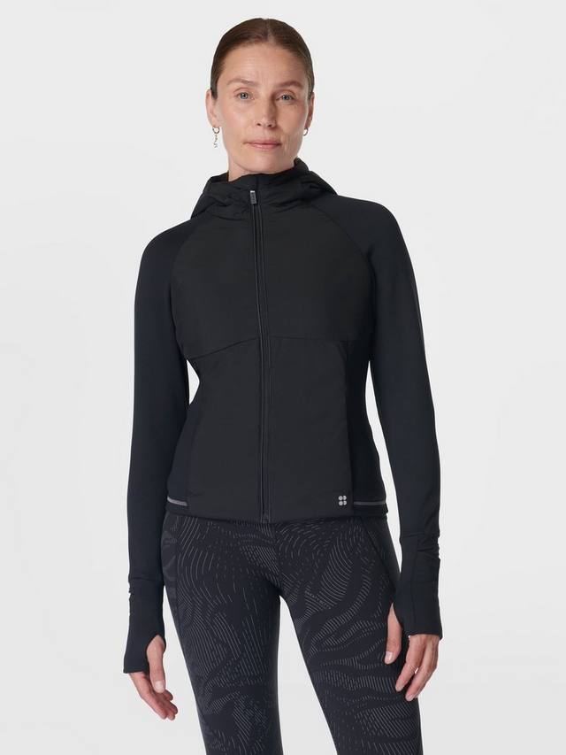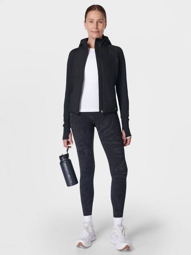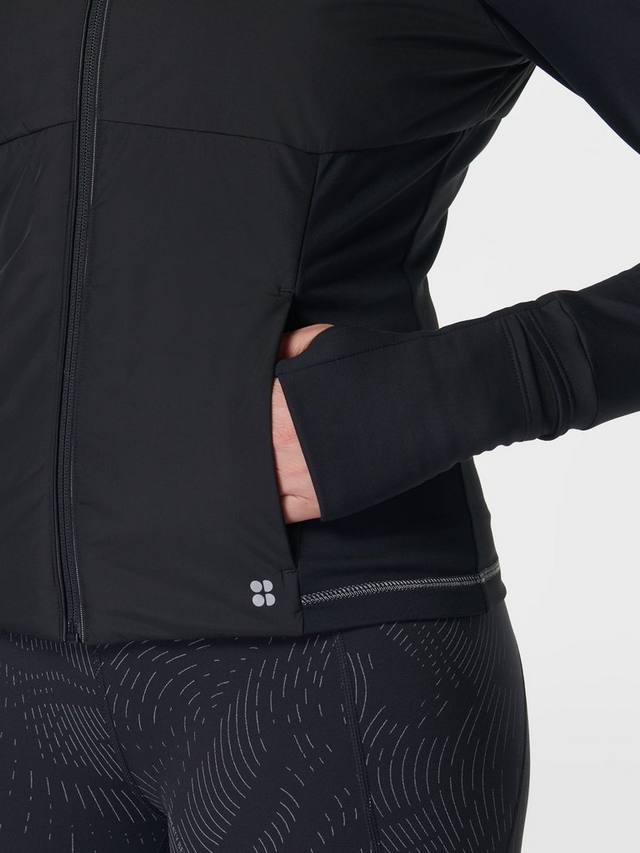 Утеплённая водонепроницаемая куртка для зимних пробежек. Верхний слой утеплителя PrimaLoft спереди, сзади и внутри капюшона. Куртка входит в инновационную коллекцию HeatProtect от Sweaty Betty и имеет рейтинг Mid для дышащей и лёгкой термозащиты в ненастную погоду. Два кармана на молнии, прорези для больших пальцев и отверстие для часов на запястье. Светоотражающая окантовка и надпись с эффектом мокрой ткани.