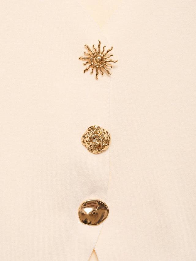 Начни свой день в этой простой куртке с V-образным вырезом. Классический крой и длинные рукава обеспечивают комфорт и гибкость, что делает ее отличным выбором как для напряженных рабочих часов, так и для непринужденных прогулок. Спереди застегивается на пуговицы с эффектом драгоценных камней.