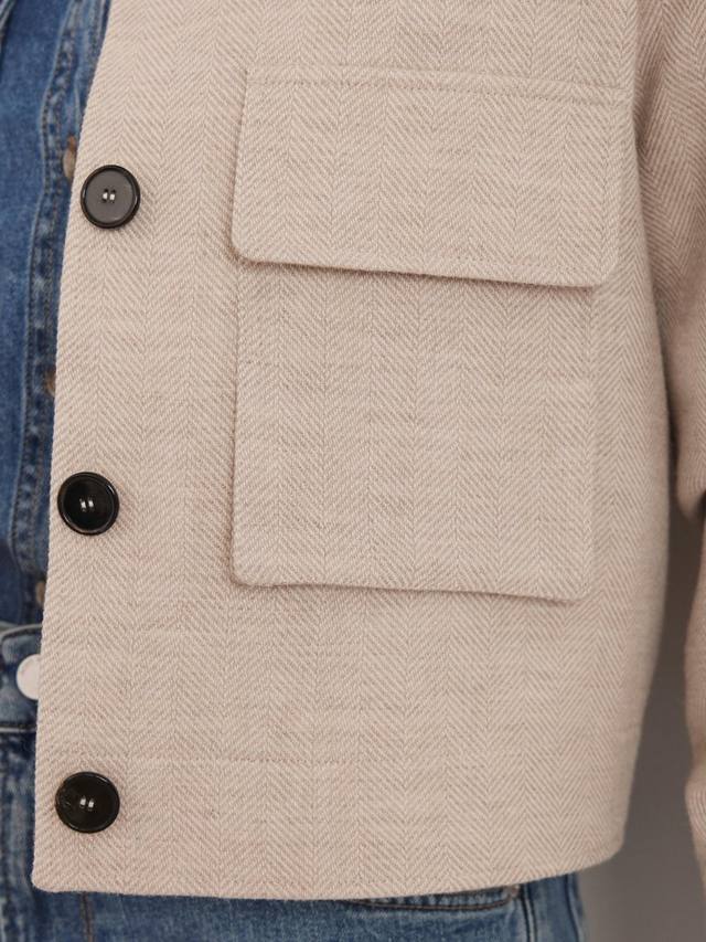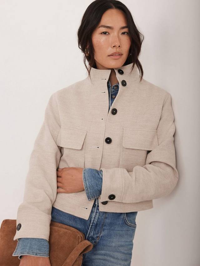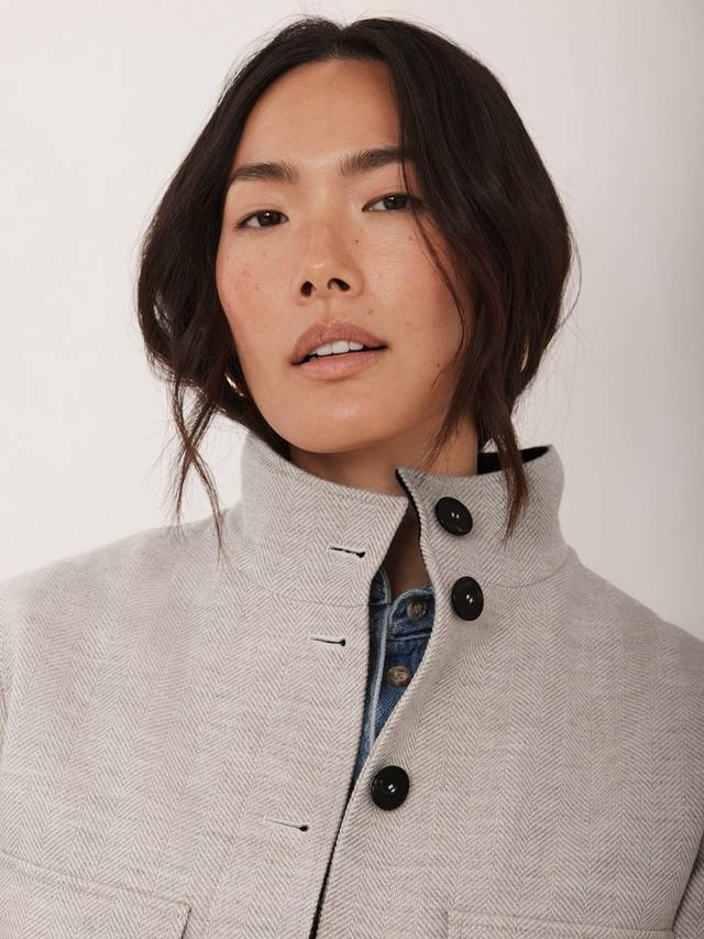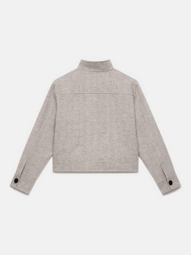 Жакет с узором ёлочка с высоким воротником, длинными рукавами, манжетами на пуговицах, квадратными карманами с клапанами и застежкой на пуговицы спереди.