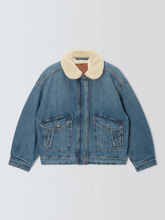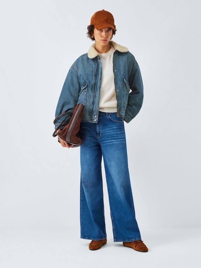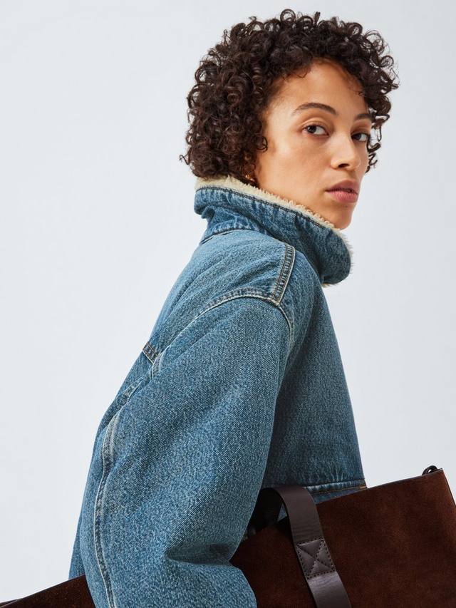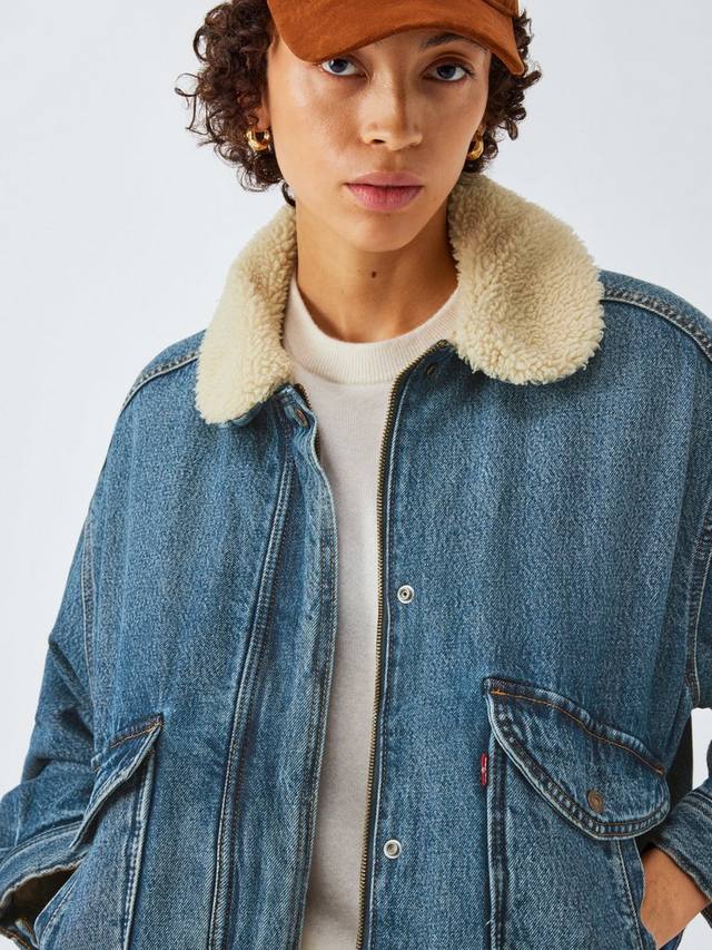 Куртка-бомбер из чистого хлопкового денима с воротником из шерпы для длительного комфорта. Классический крой и застежка на пуговицы делают её отличным выбором — она легко охлаждает и идеально подходит для ношения в прохладную погоду.