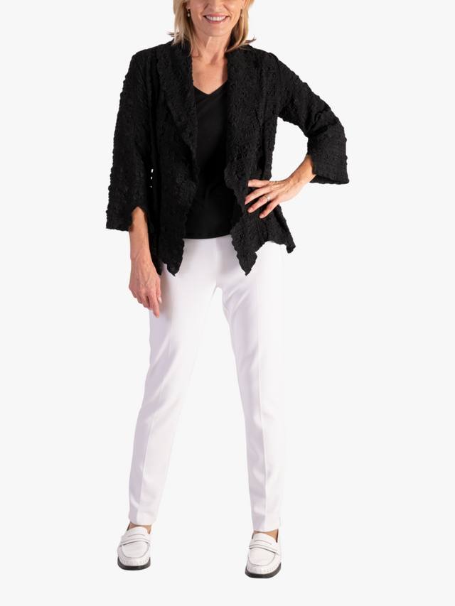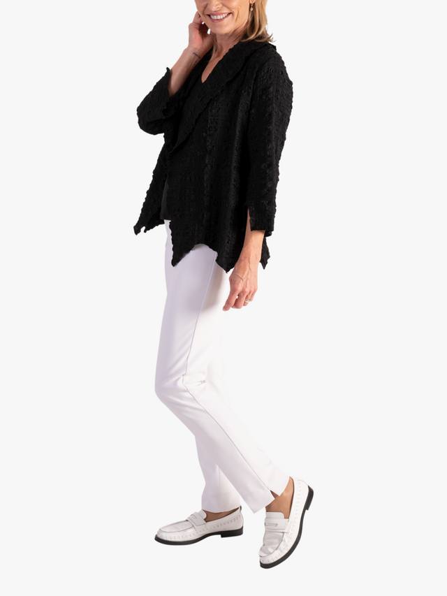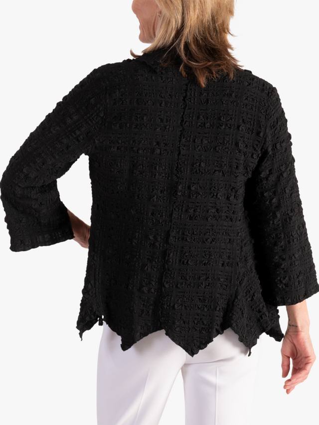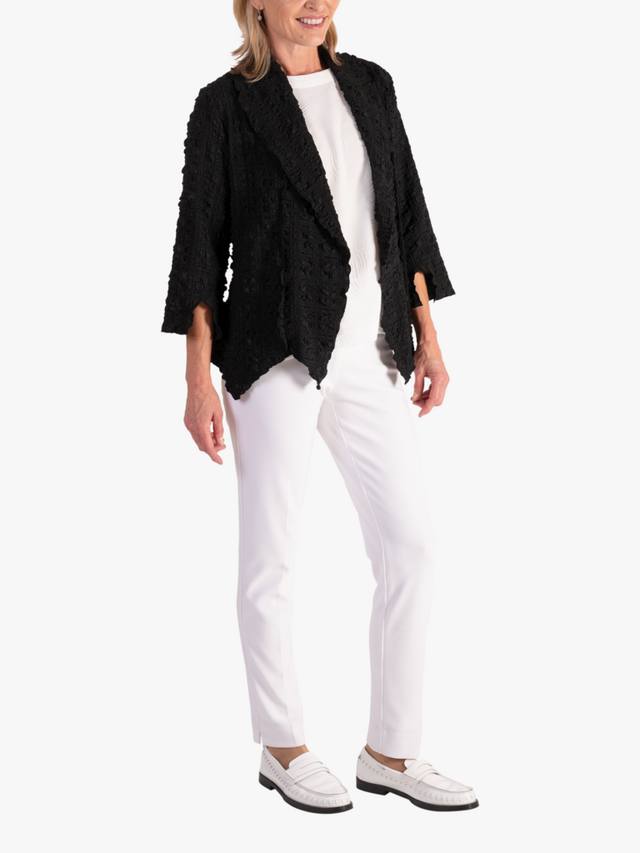 Элегантный предмет многослойного гардероба на любой случай. Эта легкая куртка удобного кроя представлена в универсальном коротком фасоне. Вырез шалью и выразительный фактурный геометрический рисунок создают бесконечные возможности для создания элегантного повседневного образа и производят фурор!