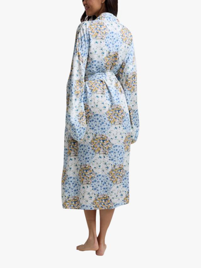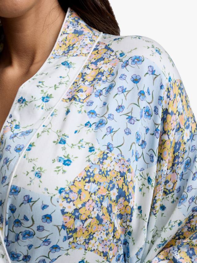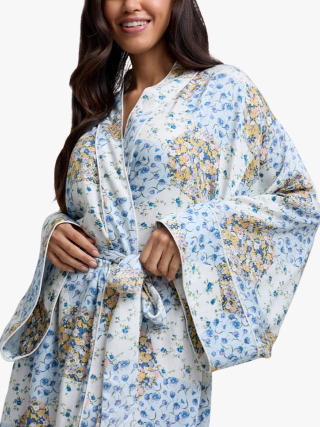 Очаровательный халат Corina сшит из нашего неповторимого мягкого вискозного атласа и украшен интересным летним принтом в стиле пэчворк. Этот свободный халат в стиле кимоно с гофрированными рукавами и съёмным поясом создаёт изящный силуэт. Контрастная окантовка на манжетах и горловине завершает образ этой безупречно женственной вещи.