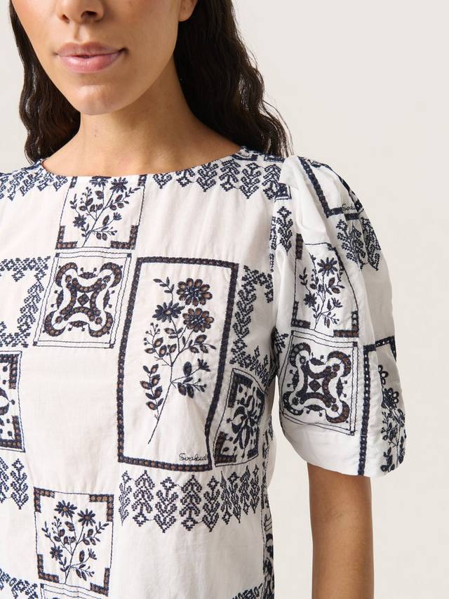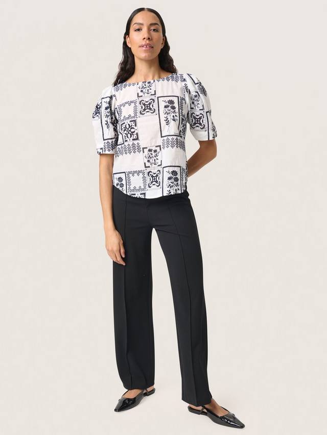 Блузка Reesha — универсальный топ с красивым принтом, который отлично сочетается с брюками, джинсами и юбкой. Круглый вырез горловины застегивается на пуговицы сзади, классический крой. Короткие рукава-фонарики свободного кроя со складками на плечах.