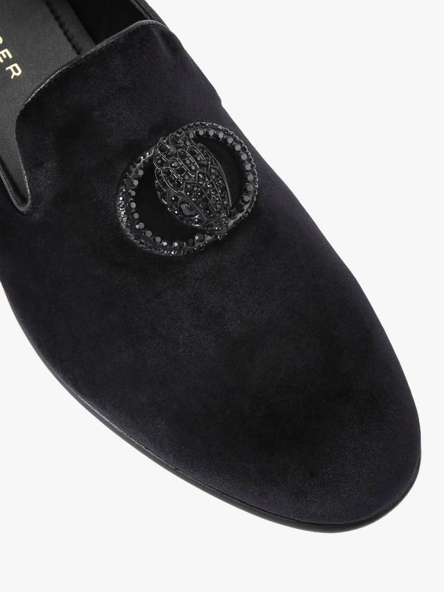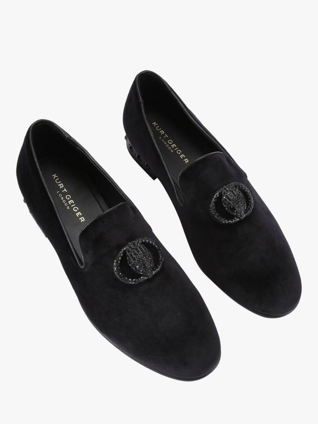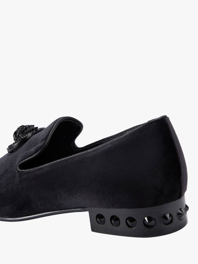 Эти лоферы Ace Chelsea — чёрные атласные туфли без застёжки. В центре носка — чёрная овальная отделка с головой орла, украшенная кристаллами. На пятке — украшение из кристаллов.