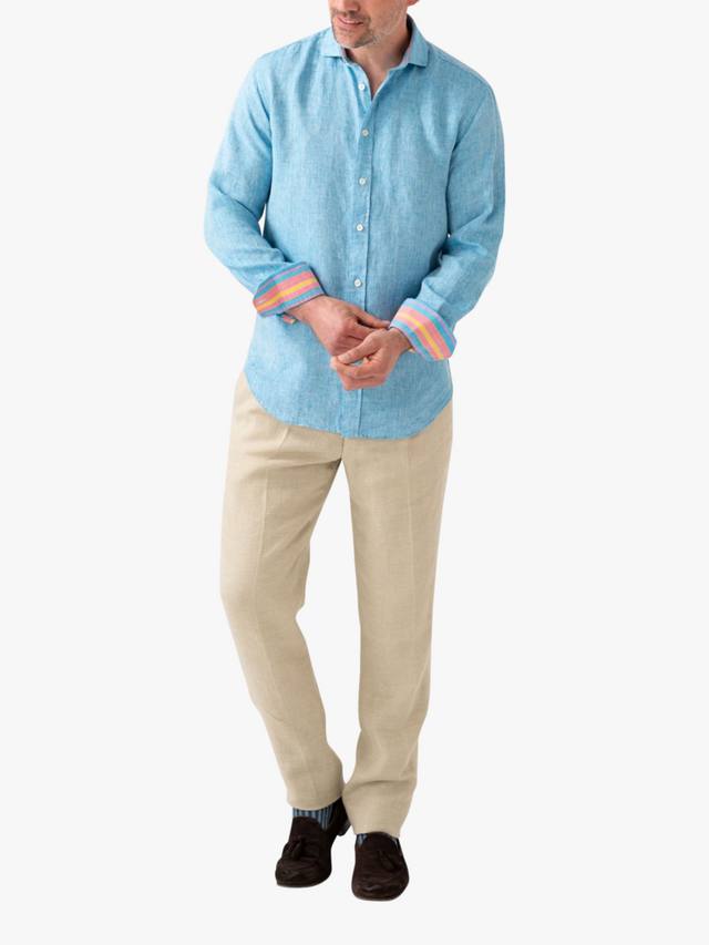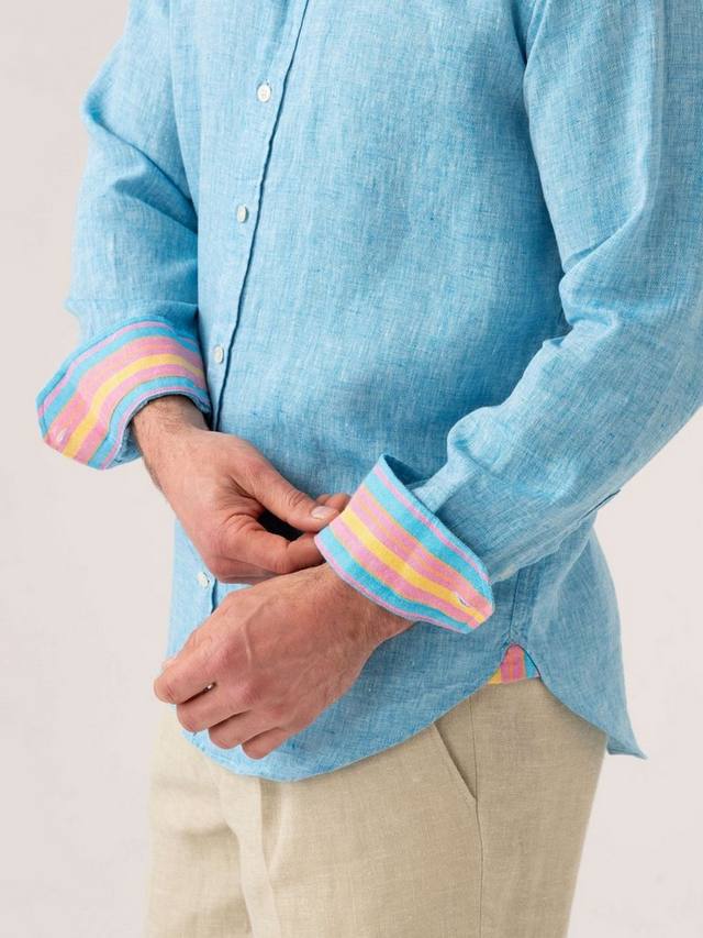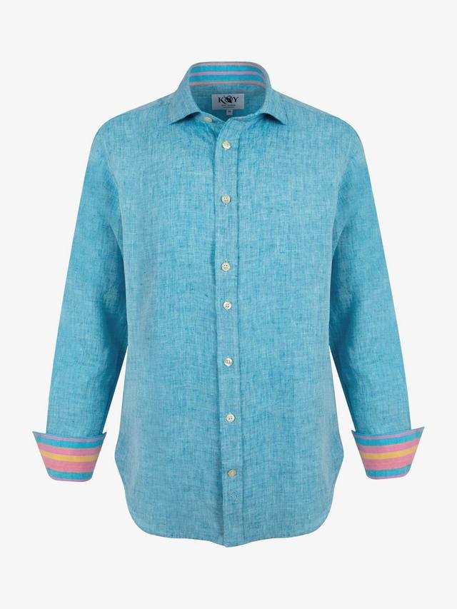 Ярко-бирюзовая льняная рубашка из 100% льна с эффектными вставками из африканской ткани кикой в розовую полоску. Яркие розовые полоски придают этой рубашке уникальный вид, наполненный глубокой историей и глубоким смыслом.