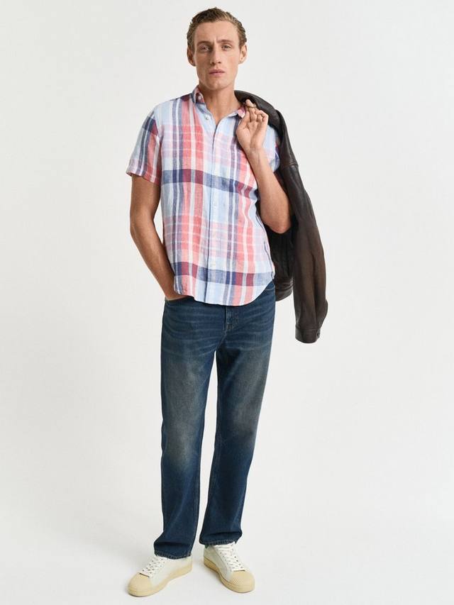 Эта рубашка с короткими рукавами, сшитая из 100% льна в классическую индийскую клетку мадрас, отличается естественной воздухопроницаемостью и лёгкостью, идеально подходит для лета. Рубашка прямого кроя с воротником на пуговицах, закруглённым подолом, нагрудным карманом с вышитым логотипом и складкой с петлёй сзади.