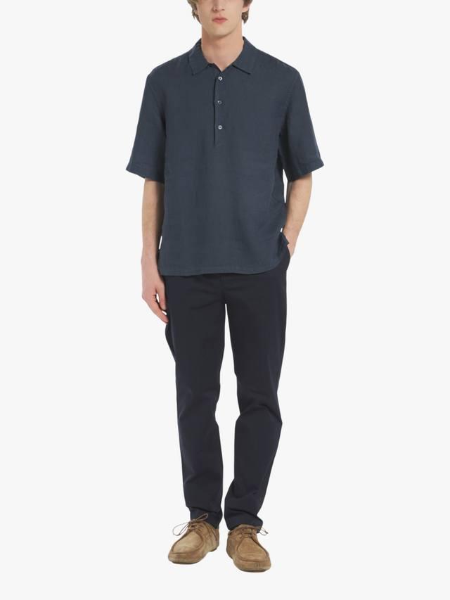Рубашка свободного кроя с короткими рукавами, застежкой на пуговицы спереди, отложным воротником и льняной тканью, окрашенной в готовом виде.