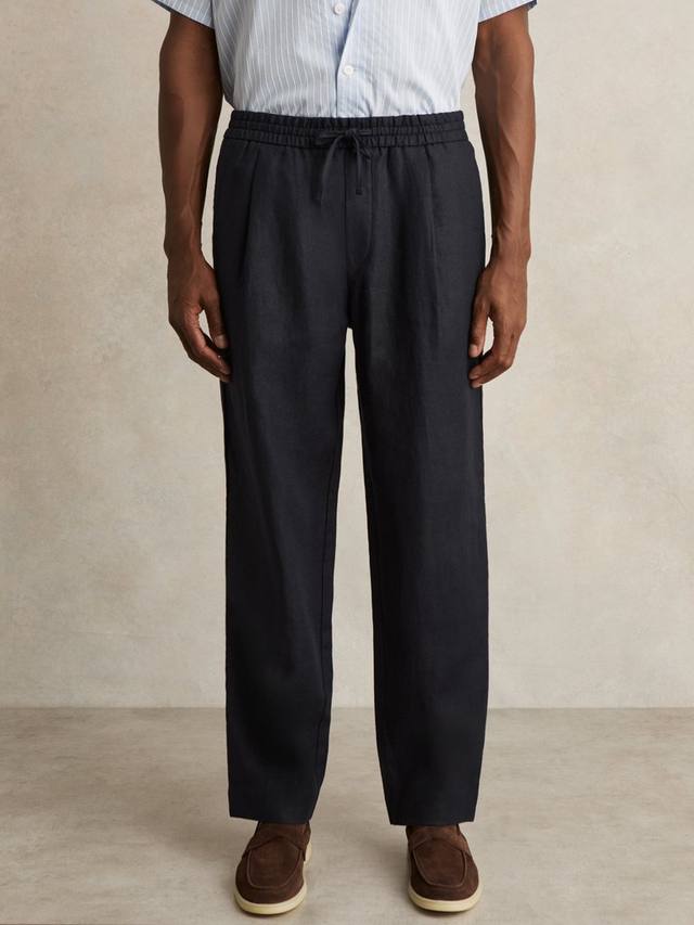 Легкие брюки Reiss Barges из 100% льна идеально подходят для теплой погоды. Они имеют удобный эластичный пояс на шнурке и тонкие складки спереди. Боковые карманы и прорезные карманы сзади.