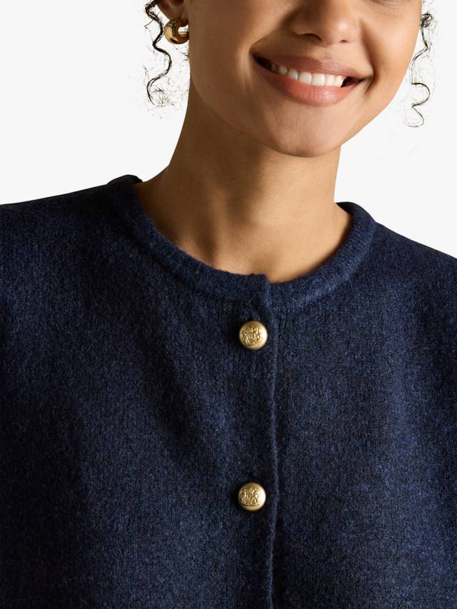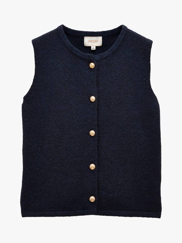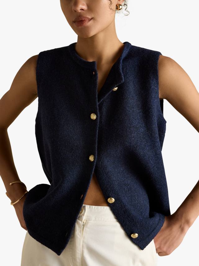 Это трикотажный жилет Holly, обновлённый к новому сезону. Он выполнен из той же роскошной мягкой трикотажной ткани и имеет прямой крой, подчеркивающий фигуру, но теперь он стал ещё более элегантным благодаря пяти металлическим пуговицам на стержнях спереди. Каждая пуговица имеет тиснение, что является знаком качества и внимания к деталям, которые всегда уделяются нашим стилям.
