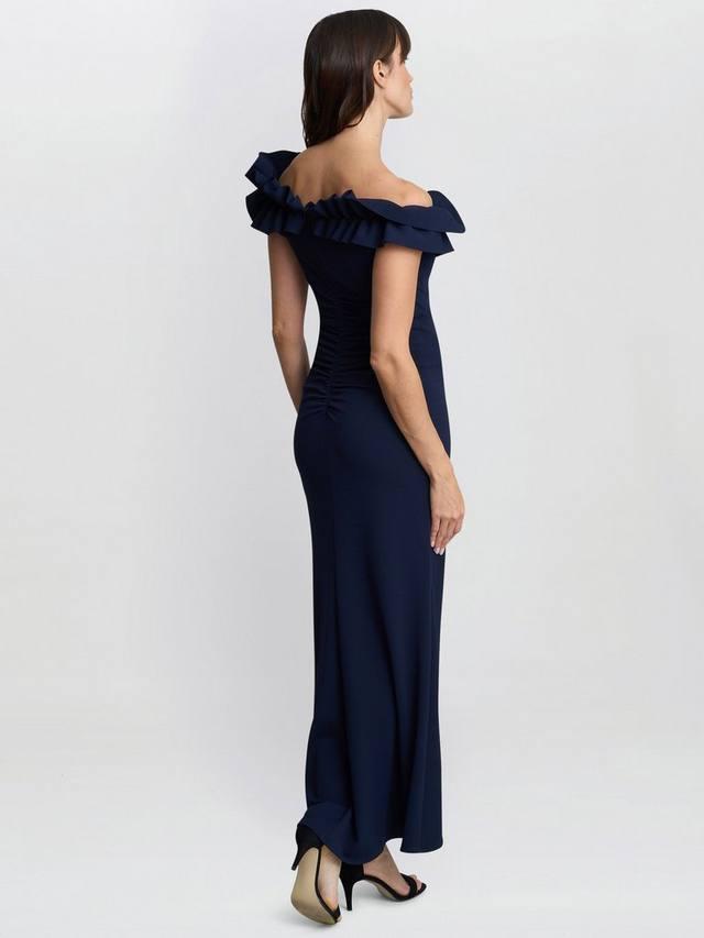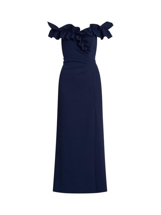 В этом макси-платье с открытыми плечами вас покорит вневременная элегантность. Модель украшена оборками на плечах и вырезе. Оборка на лифе добавляет женственности, а мягкая драпировка на талии создает изящный силуэт.