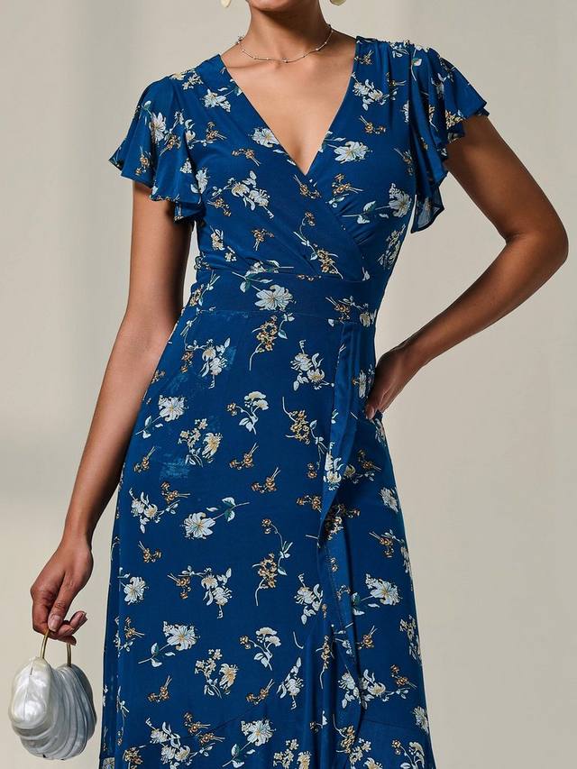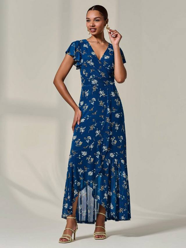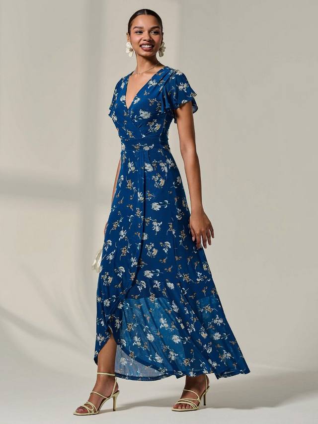 Это длинное платье с короткими рукавами от Jolie Moi украшено вырезом-оберткой и множеством цветочных мотивов.