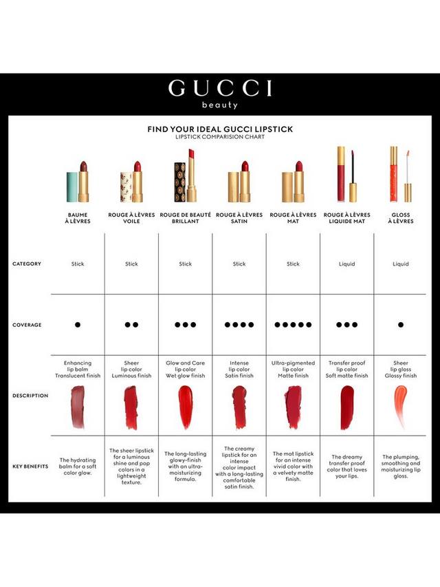 Помада Rouge à Lèvres Matte дарит губам яркий и насыщенный цвет, дарит ощущение мягкости и бархатистости, а её текстура шёлковая и комфортная, не пересушивая губы и не размазываясь. Палитра коллекции включает насыщенные нюдовые, оранжевые и розовые, красные, фиолетовые и величественный зеленый оттенки, вдохновленные особым тоном, который можно увидеть в нарядах Алессандро Микеле, представленных на подиуме.