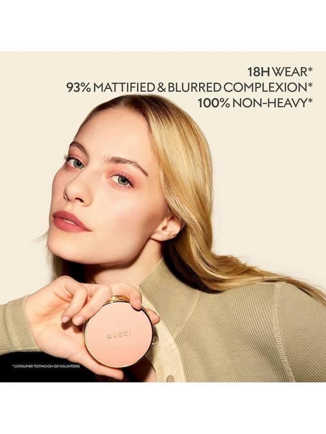Одно касание — и всё с новой матовой пудрой Gucci. Стойкая пудра с матирующей текстурой, которая контролирует жирный блеск и фиксирует кожу, мгновенно придавая ей естественный матовый оттенок и создавая непринуждённый образ.