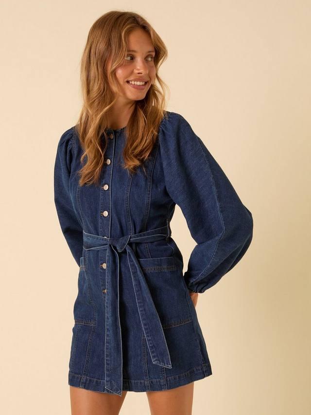 Для джинсовой одежды. Это мини-платье из джинсовой ткани средней степени стирки с длинными рукавами-фонариками и эффектной застёжкой на пуговицы спереди. Нам очень нравится регулируемый пояс, утягивающий талию, для идеальной посадки.