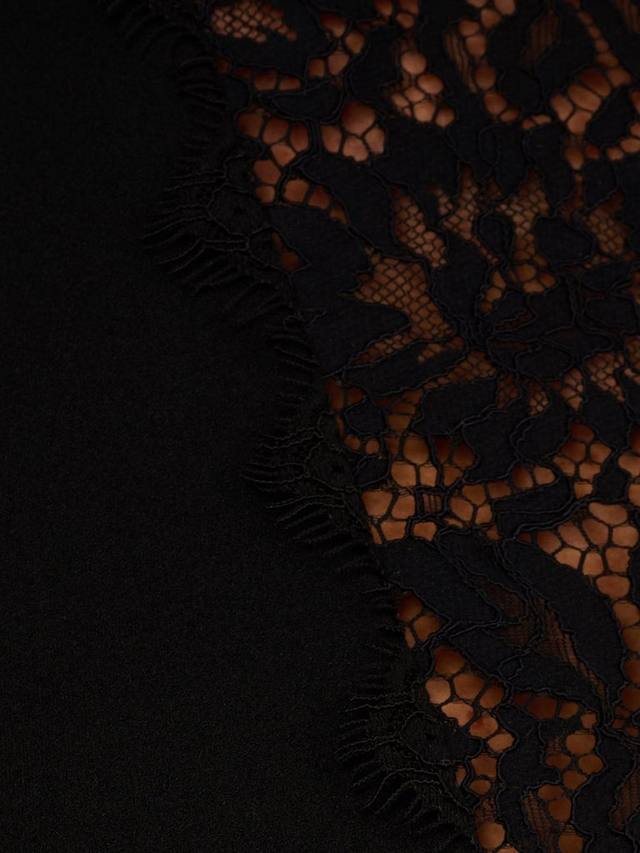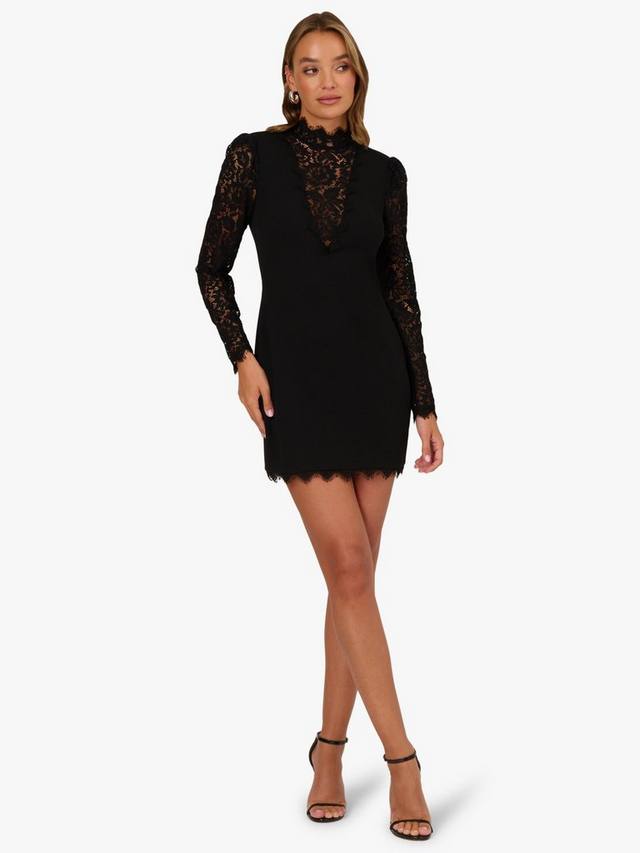 Современное, но в то же время невероятно романтичное, это мини-платье элегантного облегающего силуэта сшито из нежной кружевной ткани. Длинные прозрачные рукава подчеркивают фигуру, а имитация воротника-стойки накладывается на глубокий вырез, создавая эффектный контраст. Фестончатая окантовка с ресничками подчеркивает воротник, манжеты и подол, придавая изящный вид. Это милое маленькое платье станет элегантным выбором для коктейльных вечеринок или вечерних выходов, где бы вы его ни надели.
