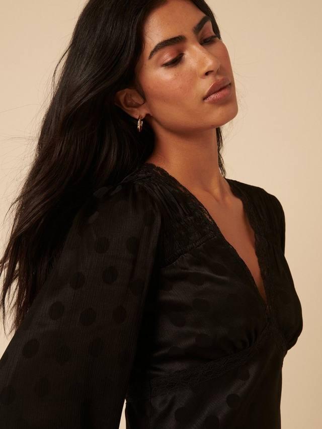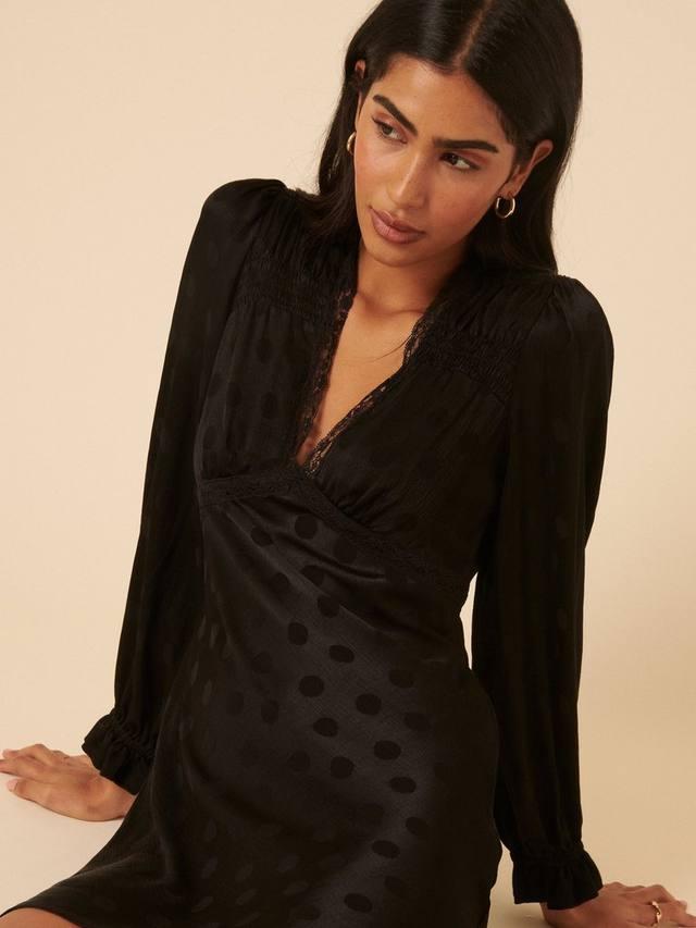 Платье для свидания. Это мини-платье в горошек с рюшами и кружевным V-образным вырезом делает его идеальным маленьким чёрным платьем. Добавьте каблуки для завершения образа.