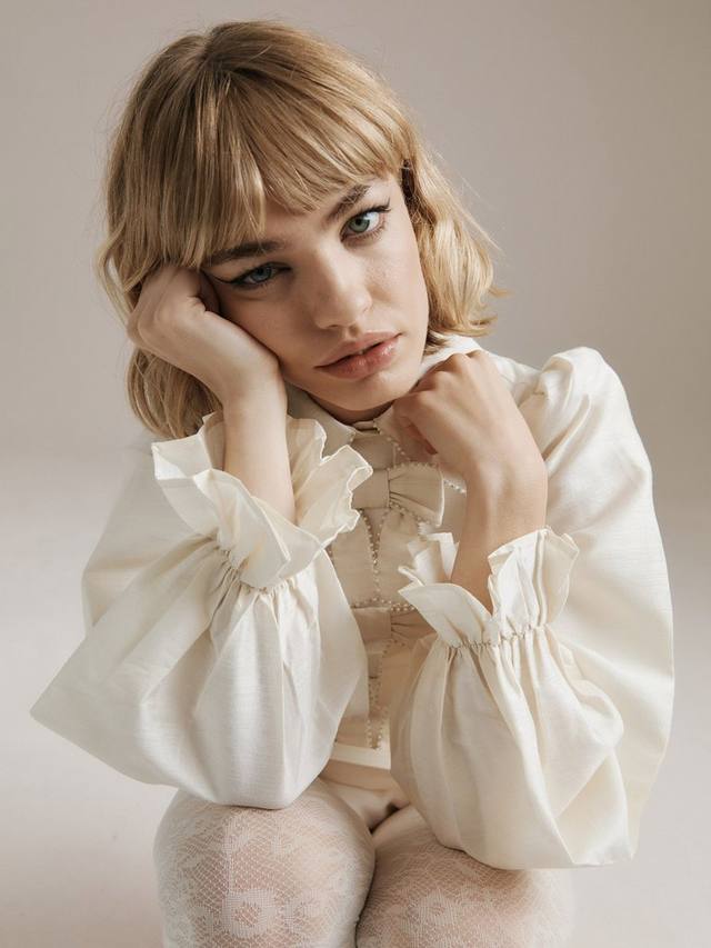 Мини-платье А-силуэта из двойного шёлка с воротником-стойкой и бантами, вручную расшитыми жемчужными бусинами. Застёжка-молния сзади.