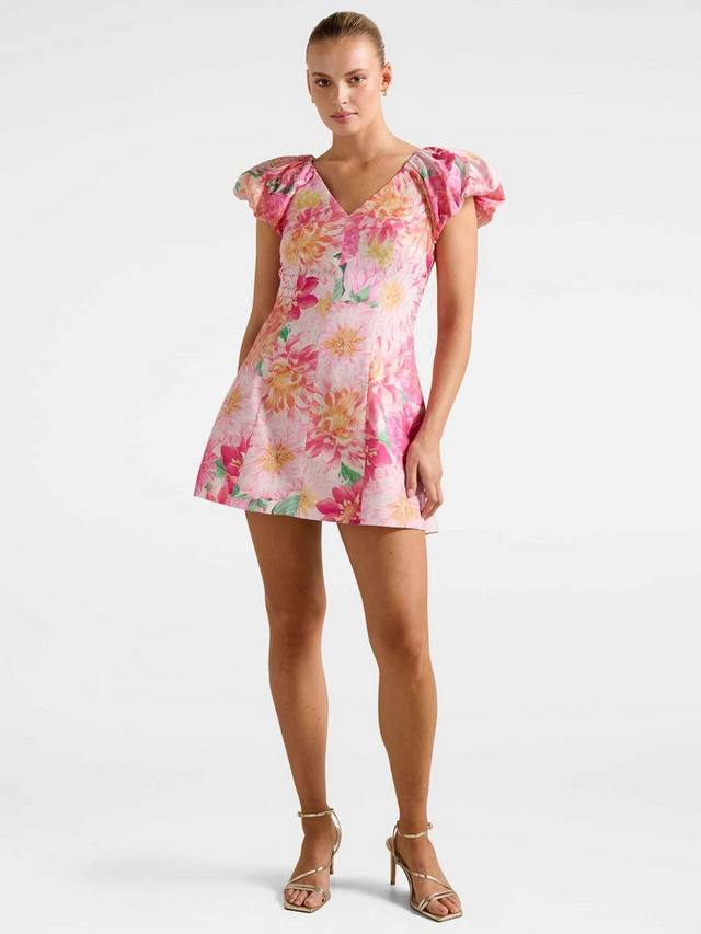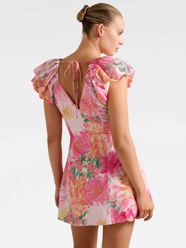 Подчеркните свою индивидуальность в этом мини-платье с цветочным принтом, которое выгодно подчеркивает фигуру и расклешённый силуэт, игривые рукава-крылышки и буфы, V-образный вырез и завязывается на завязке. Платье идеально подходит для вечера или дня соревнований, подкладка обеспечивает комфорт и свободу движений.