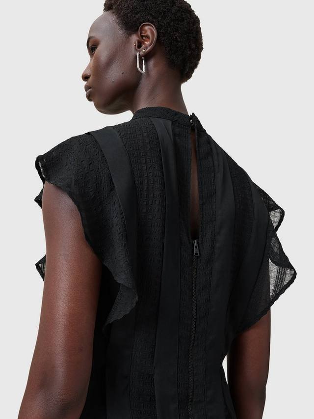 Это платье от AllSaints, выполненное из полосатого атласа и полупрозрачных вставок спереди, имеет асимметричную, расклешенную длину мини. Благодаря круглому вырезу и рукавам-крылышкам, платье может показаться простым по крою, но его юбка с рюшами создает много движения и текстуру.