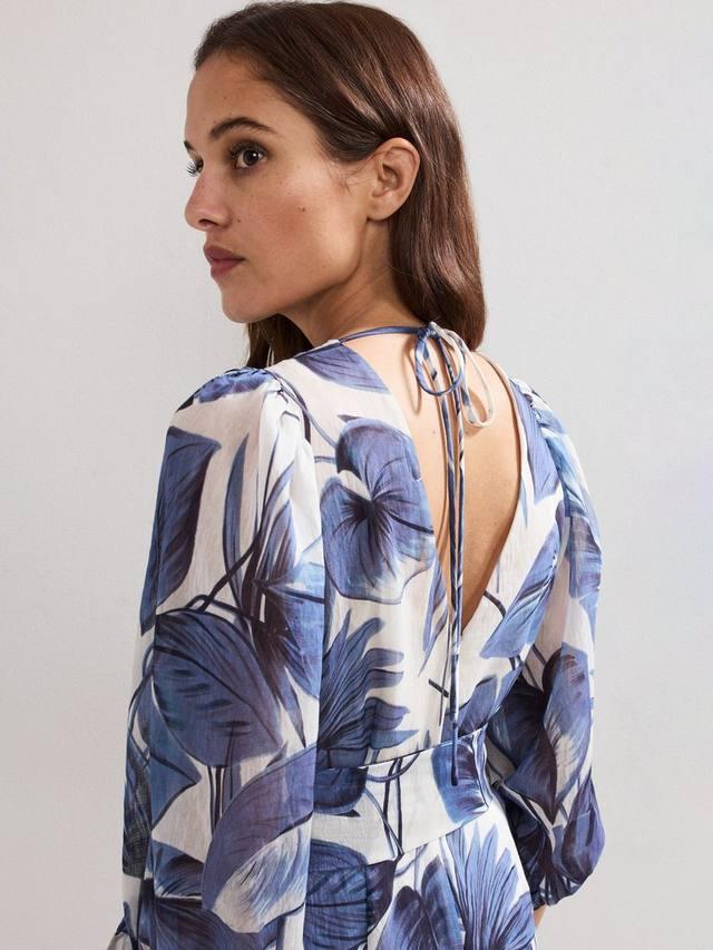 Это мини-платье с принтом идеально подходит как для летних мероприятий, так и для отпуска. Укороченные рукава-блузоны создают лёгкий объём, а V-образный вырез и спинка добавляют современный и женственный вид. В сочетании с обувью на плоской подошве или каблуке этот удобный силуэт станет неотъемлемой частью вашего гардероба для тёплой погоды.