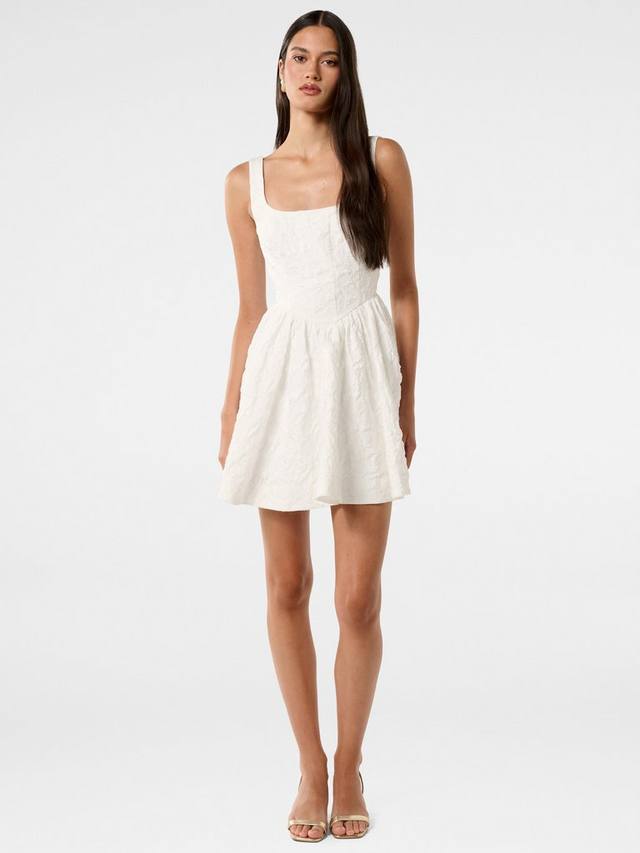Это мини-платье от Forever New с облегающим лифом и пышной юбкой выполнено из мягкой смеси тканей. Модель с модным квадратным вырезом и плотным жаккардовым узором.
