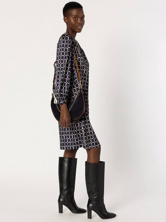 Это мини-платье сочетает в себе игривый геометрический рисунок с подчеркивающим фигуру А-образным кроем и V-образным вырезом.