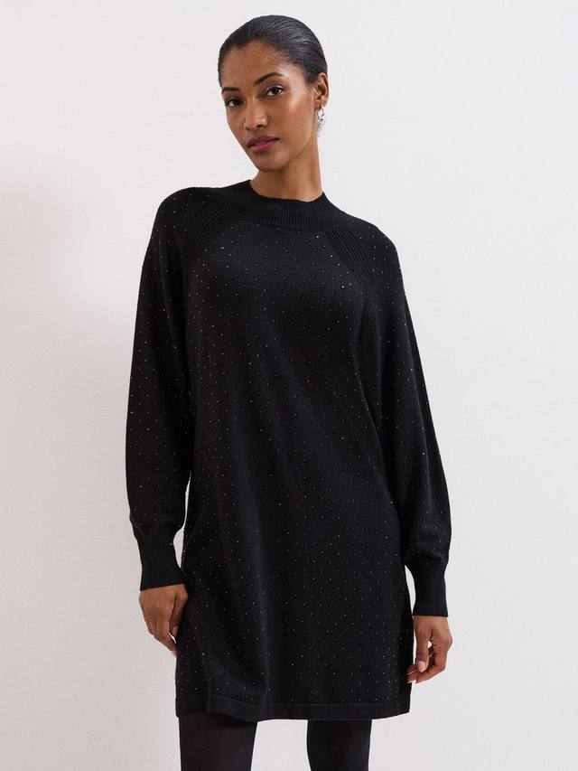 Мини-платье с изюминкой. Эта уютная модель с высоким круглым вырезом и длинными рукавами-блузоном переходит в мини-длину, которую мы любим носить с сапогами и колготками как днем, так и вечером. Отделка заклепками, мерцающими при движении, делает это платье неотъемлемой частью современного гардероба, к которому вы будете возвращаться в этом сезоне и в будущем.