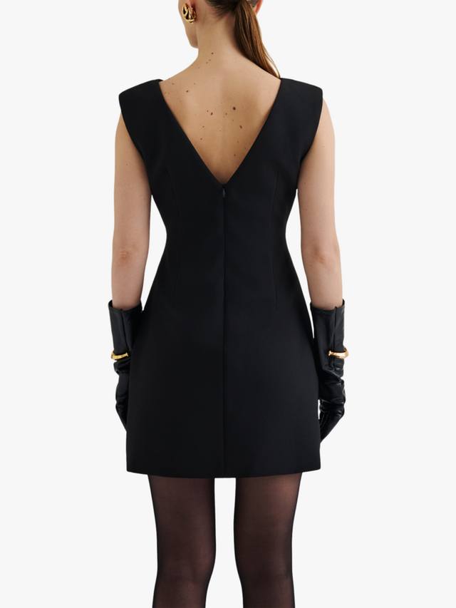 Это платье от Malina с подчеркнуто облегающим силуэтом, длиной до бедра, имеет вырез лодочкой и V-образный вырез на спине.