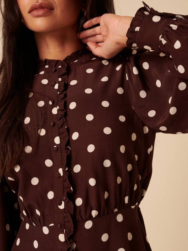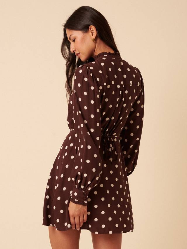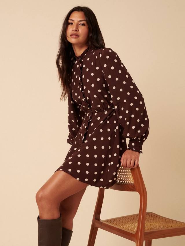 Планы на выходные уже на подходе. Это мини-платье в горошек с застёжкой на пуговицы спереди дополнено игривыми оборками. Нам также нравится её свободная мини-юбка.