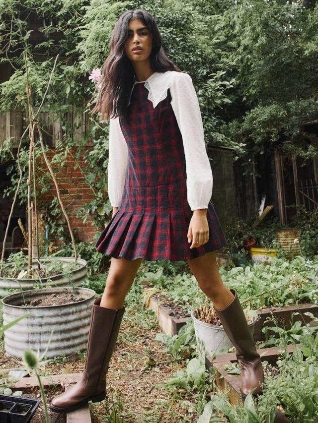 Это мини-платье из вельвета с клетчатым узором отличается круглым вырезом и заниженной талией. Нам нравится его плиссированная юбка, которая обеспечивает дополнительную свободу движений.