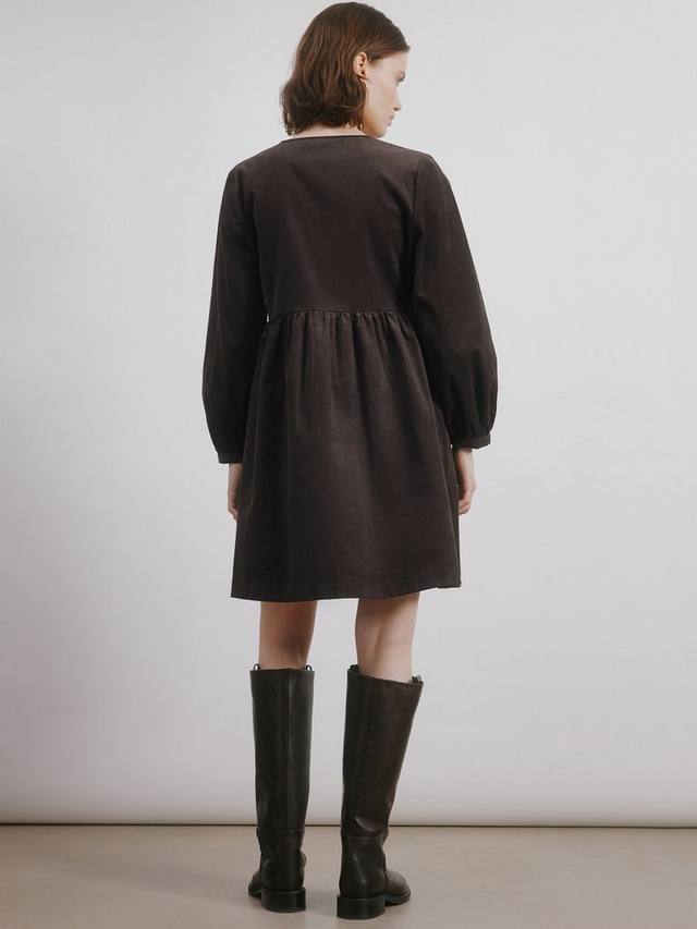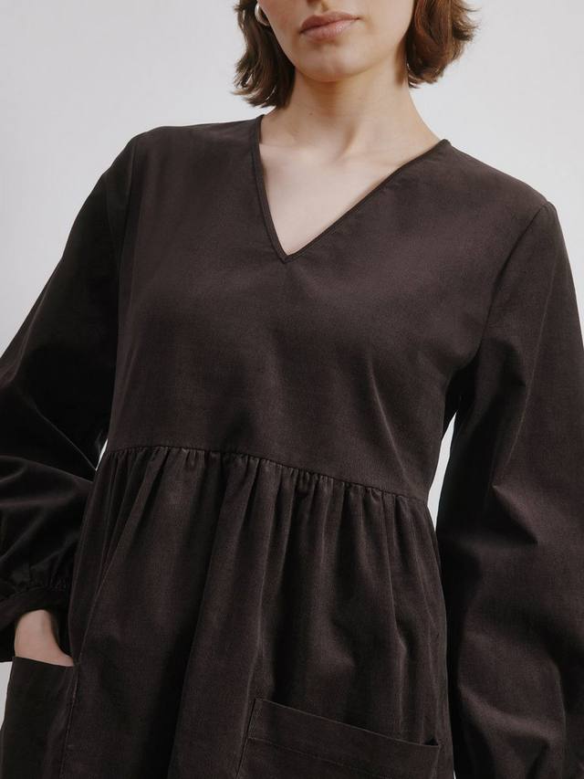 Насладитесь роскошным комфортом этого короткого платья с V-образным вырезом из гладкой и приятной на ощупь ткани вельвет. Рукава-блузон и присборенная талия создают объемный силуэт, придавая платью элегантность. Накладные карманы спереди – стильная и функциональная деталь.