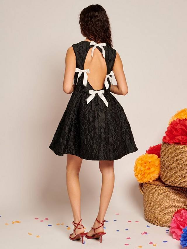 Платье длины мини из структурированного жаккардового полотна. Полностью на подкладке и с отделкой: вырез на спине в форме ромба с декоративными атласными бантиками по краям ромба. Застегивается сзади на потайную пуговицу.