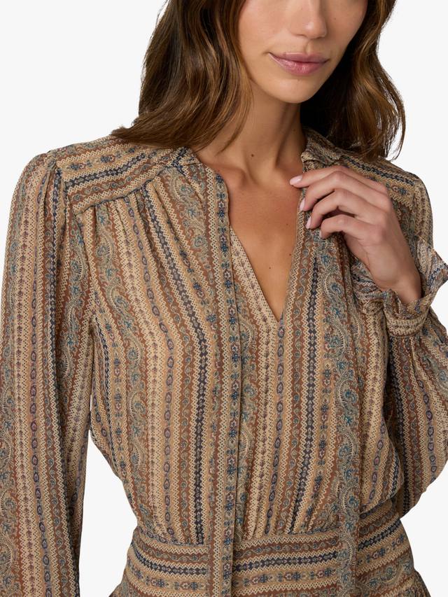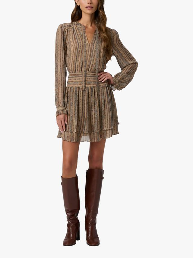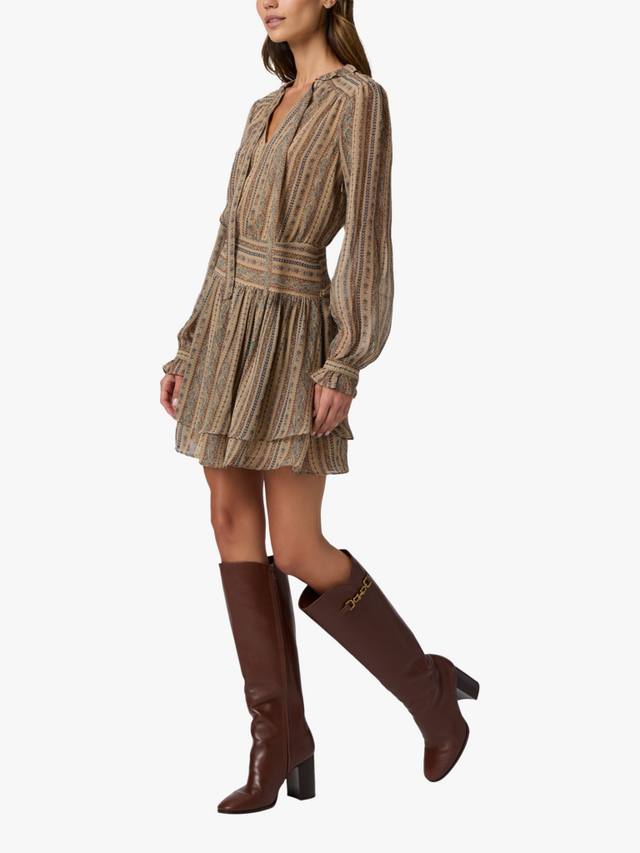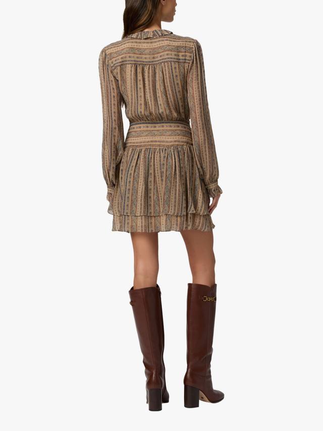Платье Nantes выполнено из 100% шёлкового жоржета с мягким коричневым полосатым узором, вдохновлённым гобеленом.