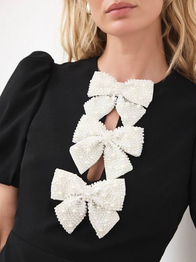 Платье мини-силуэта с круглым вырезом, замочной скважиной спереди, отделкой бантом из бисера, короткими рукавами-буфами и застежкой-молнией на спине.