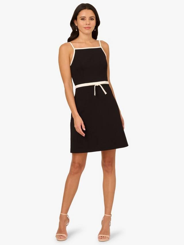 Это короткое платье из гладкой креповой ткани отличается классическим А-образным силуэтом, обеспечивающим четкие, строгие линии. Квадратный вырез и тонкие бретельки подчеркнуты контрастной отделкой, создающей современный образ. Талию подчеркивает контрастный пояс, украшенный милым бантом. Изысканная и элегантная, но при этом очень практичная модель, идеально подходит для дневных мероприятий, бранчей или неформальных торжеств.