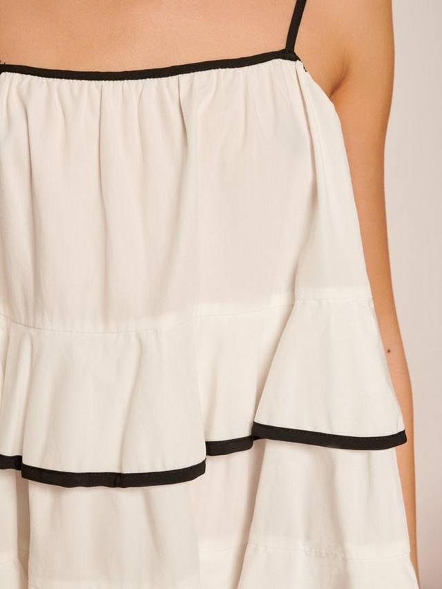 Платье длины мини из лёгкой ткани. Украшено оборками с контрастной окантовкой и регулируемыми завязками. Застёгивается на потайную молнию сбоку.