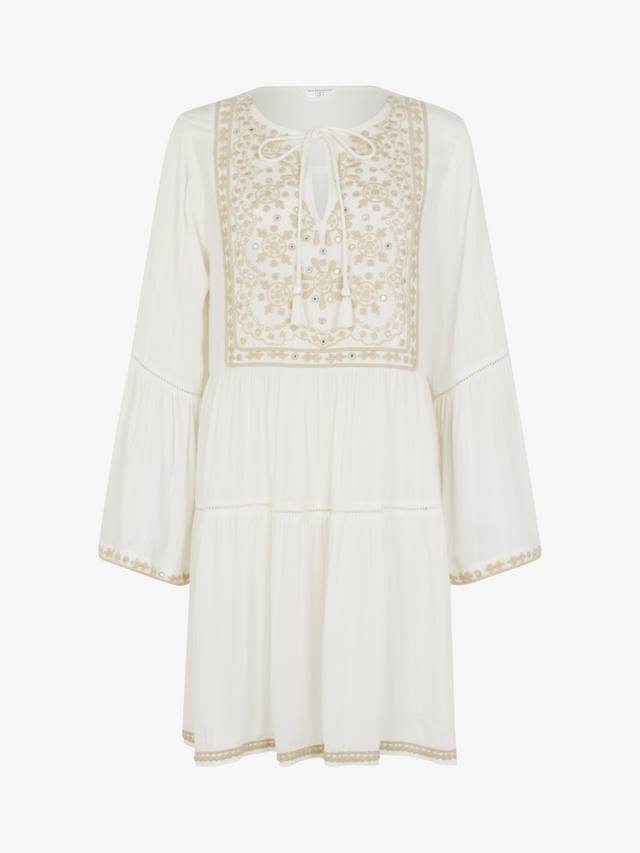 Это платье с рукавами-фонариками и роскошным мини-низом украшено вышивкой на лифе и отделке. Завязка спереди украшена кисточками.