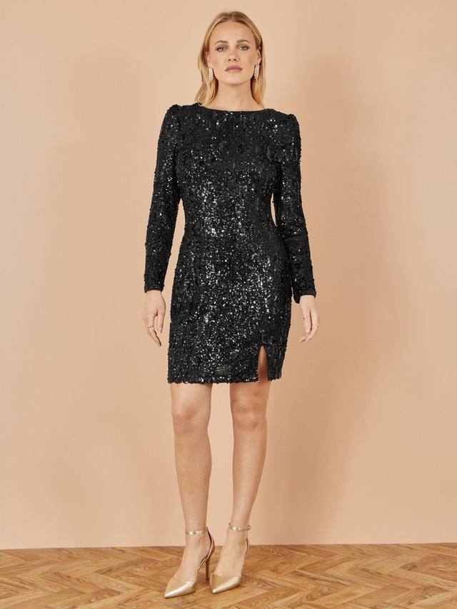 Это платье, полностью расшитое пайетками, идеально подходит для любого праздничного мероприятия. Длинные рукава, круглый вырез и короткий подол создают безупречный образ. Сзади вырез-замочная скважина.