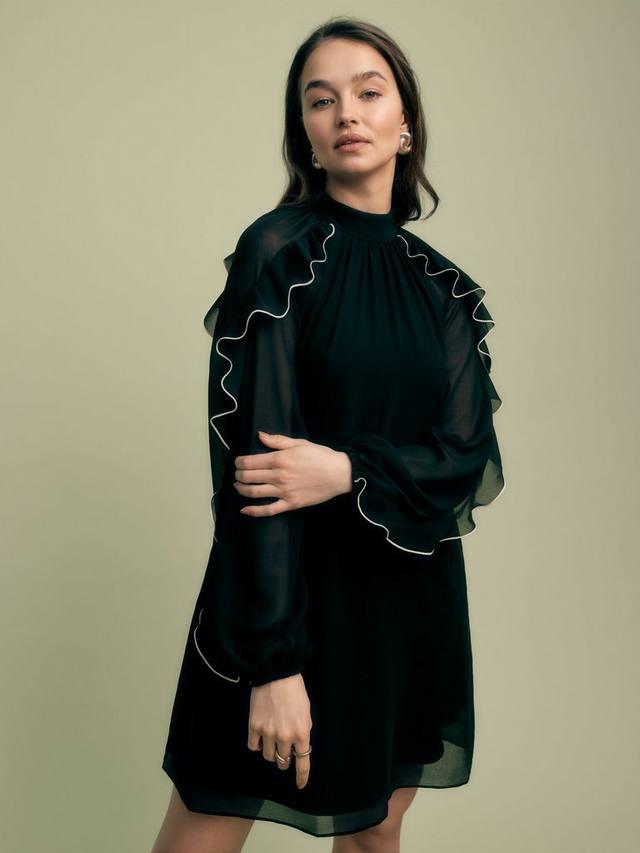 Привлекательные оборки с контрастной отделкой придают этому мини-платью современный вид — оно универсально и подойдет на все случаи жизни.