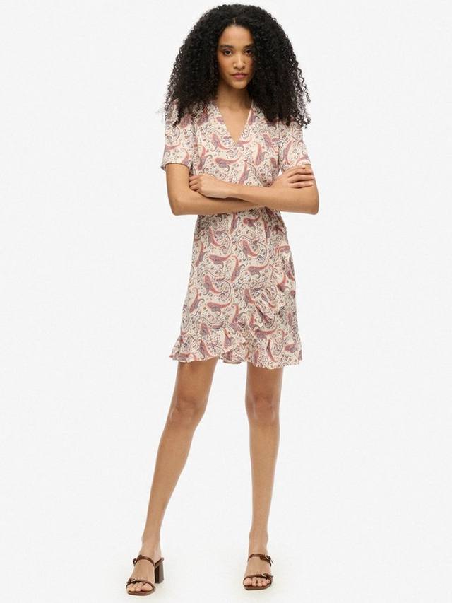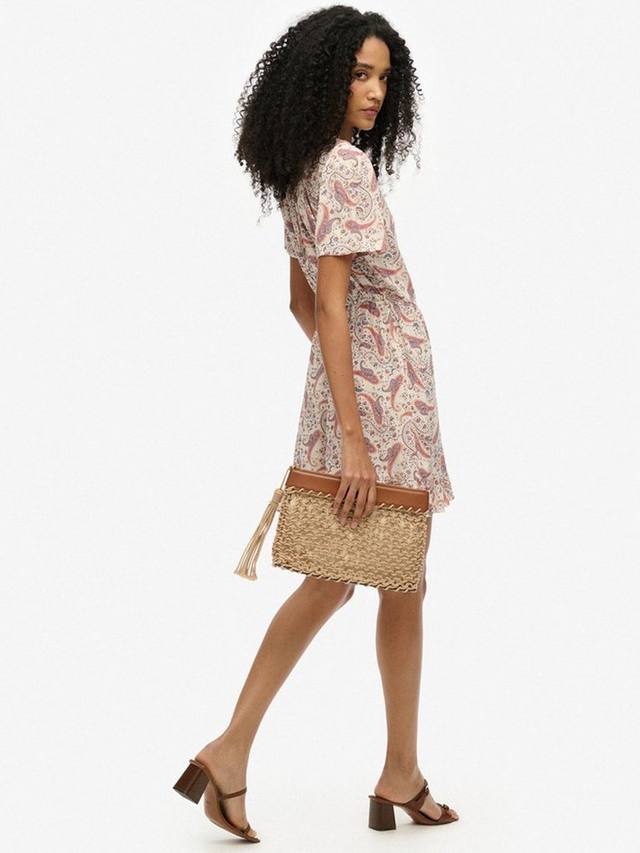 Мини-платье-халат с короткими рукавами и принтом, тщательно подобранное, с оборкой по подолу и тканым материалом, станет вашим незаменимым нарядом для летних мероприятий и отпуска. Фасон халат создает потрясающий силуэт и позволяет легко сочетать его с вашими любимыми сандалиями или кроссовками этого сезона.