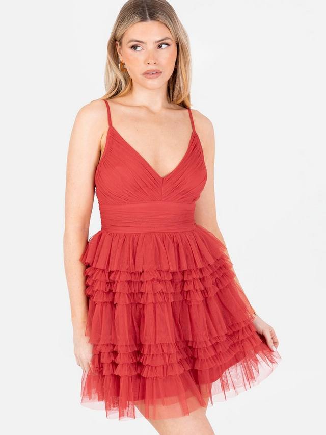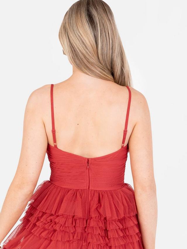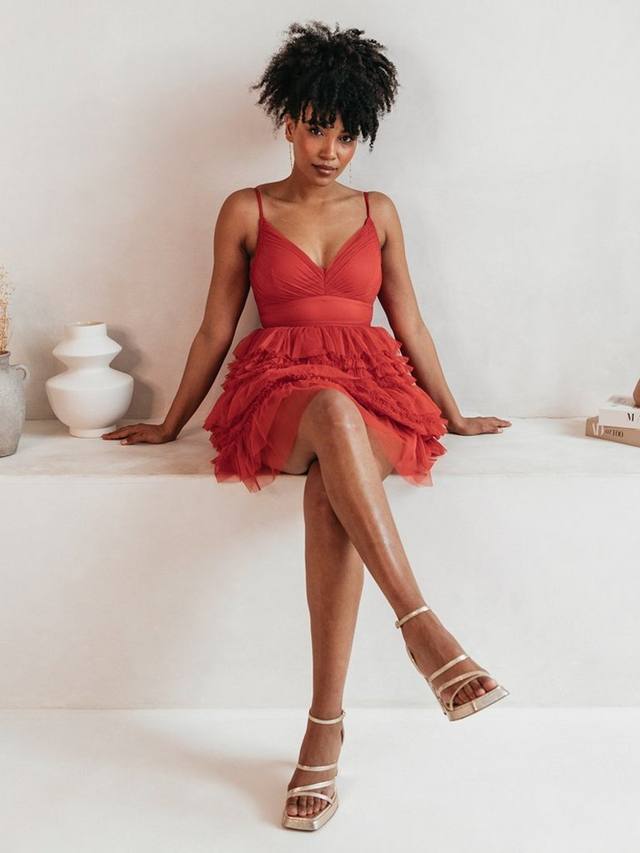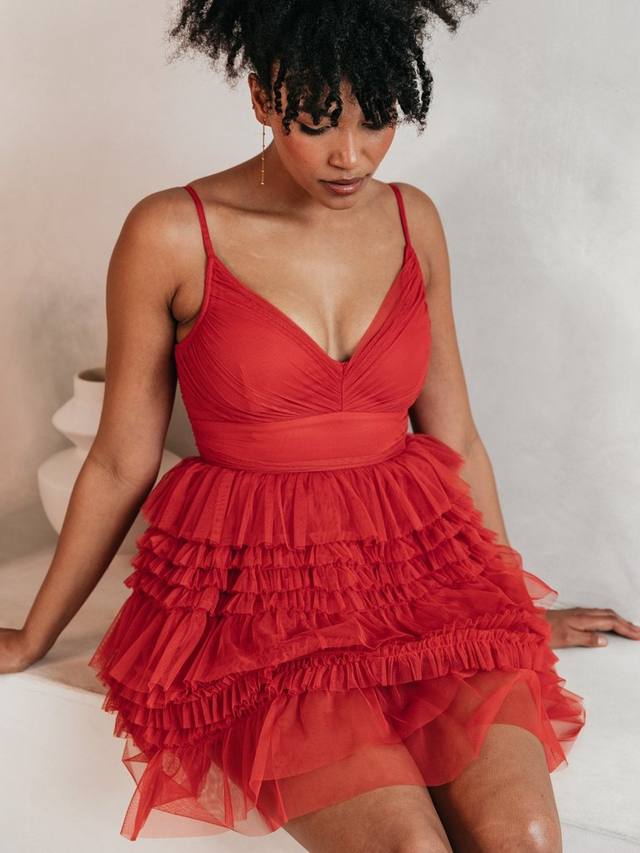 Ощутите жизнерадостный дух мини в этом игривом платье на бретельках. Присборенный лиф элегантно выполнен с регулируемыми тонкими бретельками и классическим V-образным вырезом, а горизонтально собранная талия идеально подчеркивает А-силуэт платья, создавая соблазнительный и непринужденно шикарный образ. Многослойная мини-юбка, украшенная контрастными оборками и воланами, добавляет динамичности этому кокетливому образу. Дополните его туфлями на платформе и сверкающими украшениями, чтобы создать потрясающий образ, обещающий незабываемое торжество.