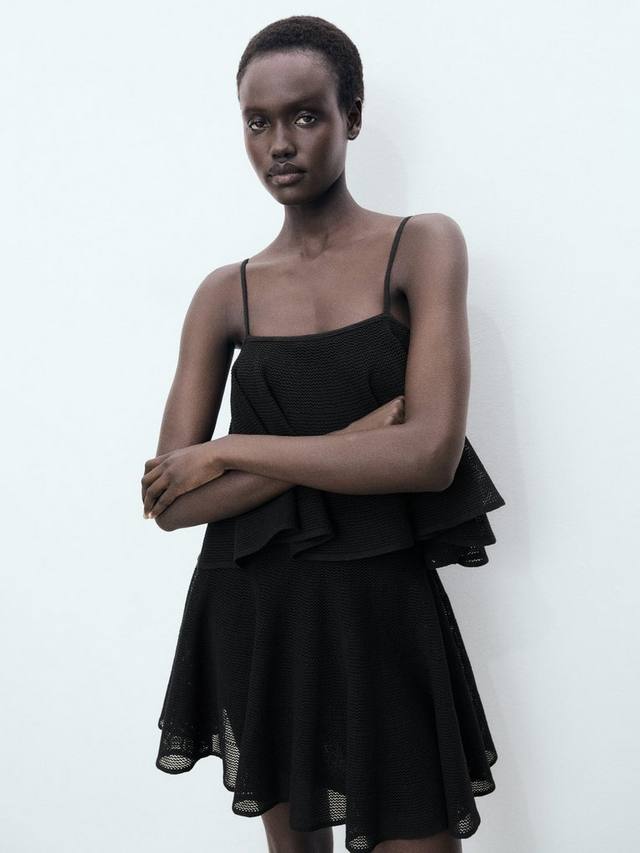 Это мини-платье от Mango с оборками и квадратным вырезом выполнено из смеси хлопка и ткани. Идеально подходит для расслабленных летних дней.