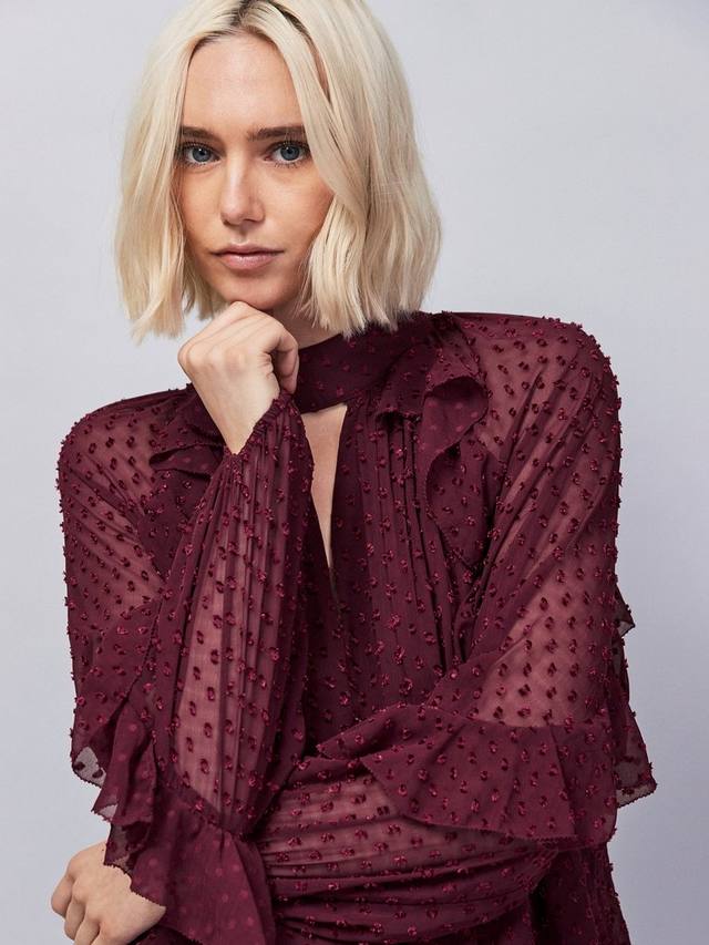 Создайте незабываемый образ в этом мини-платье Ro&Zo. Игривые оборки и фактурный узор добби, V-образный вырез и длинные рукава обеспечат вам комфорт и удобство при движении.
