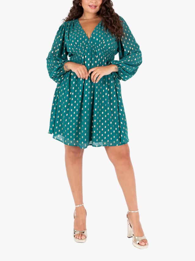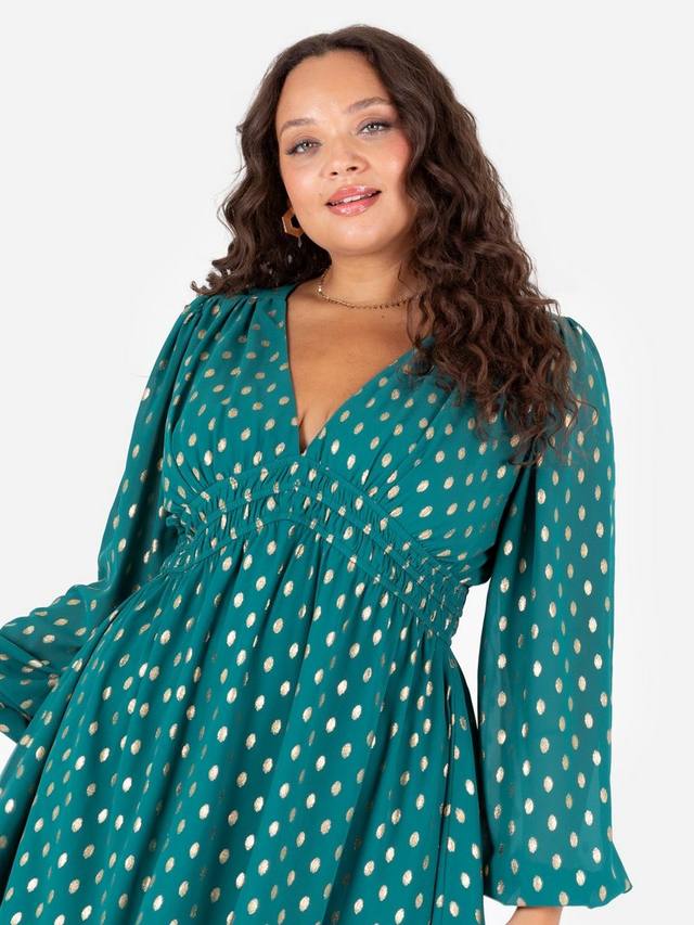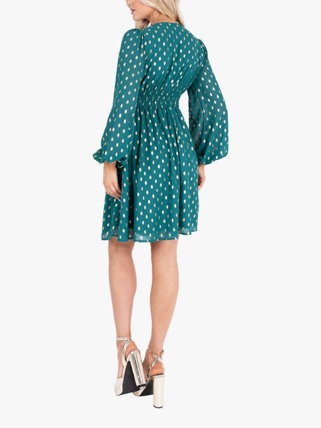 Танцеваете ли вы всю ночь или потягиваете коктейли, это мини-платье сделает каждое мгновение золотым. Изготовленное из шифона с мерцающим принтом, оно имеет V-образный вырез, струящиеся рукава, эластичную завышенную талию и кокетливую мини-юбку со слегка присборенной юбкой.