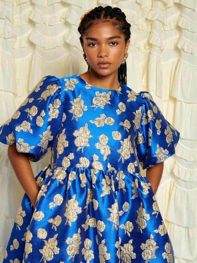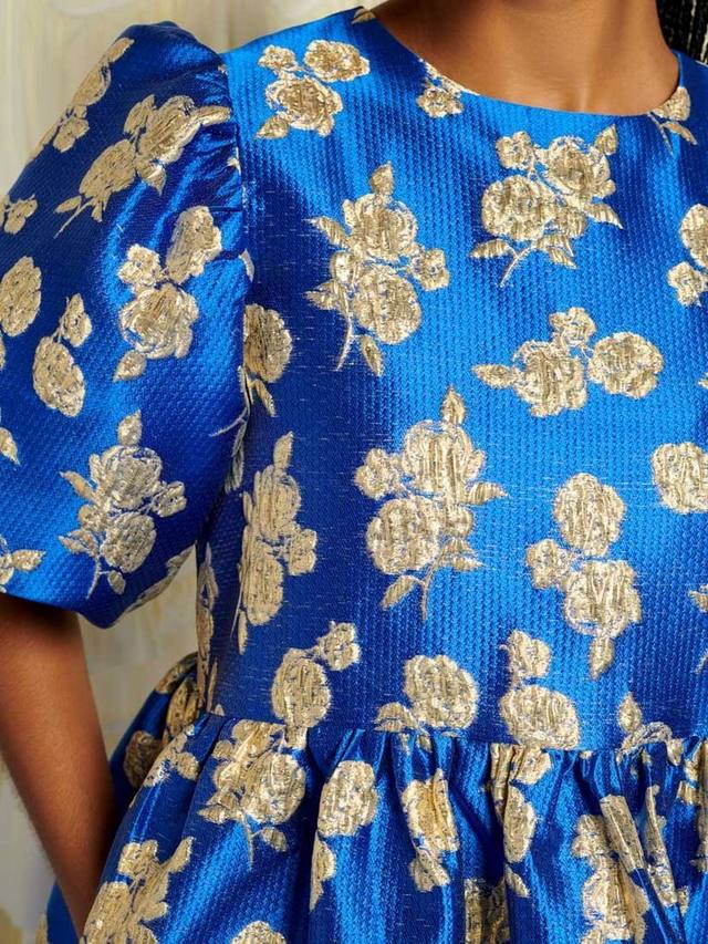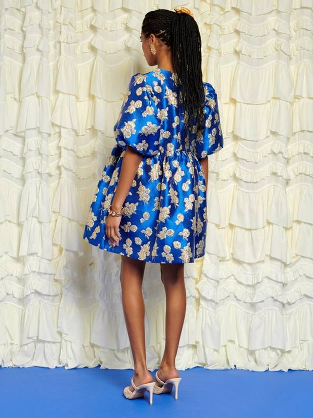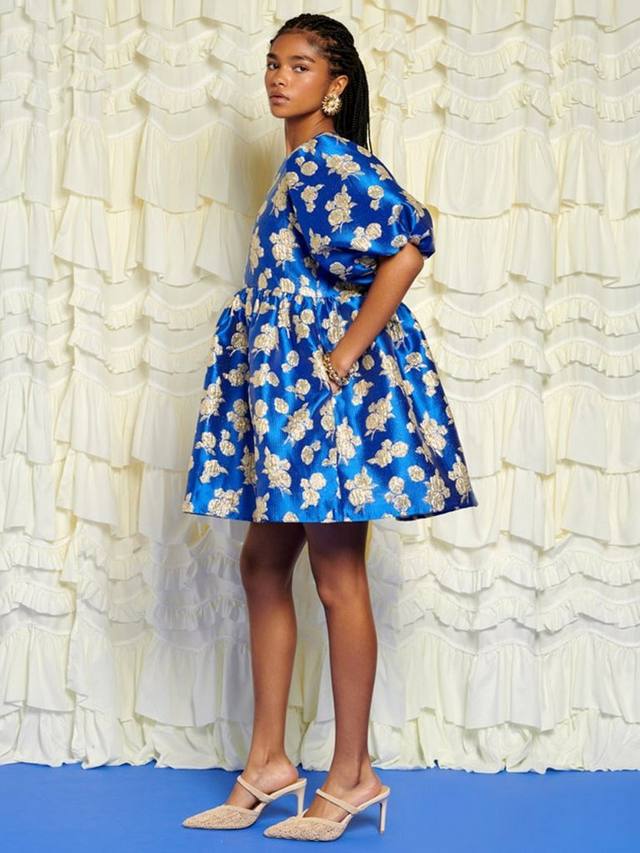 Платье мини из жаккардовой ткани с цветочным принтом. Полностью на подкладке, с эффектными рукавами-буфами и карманами в боковых швах.