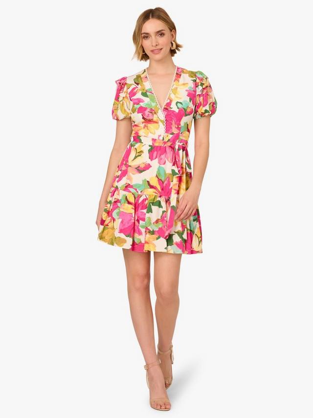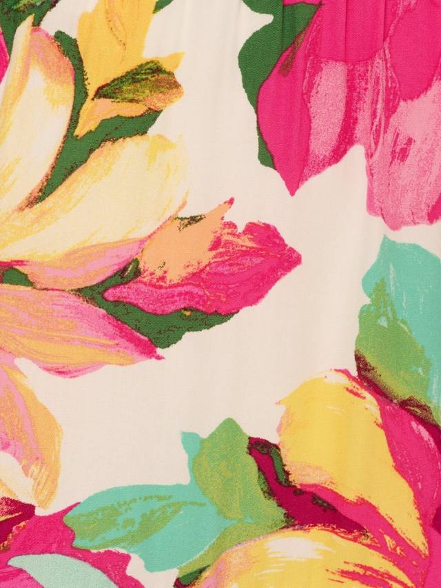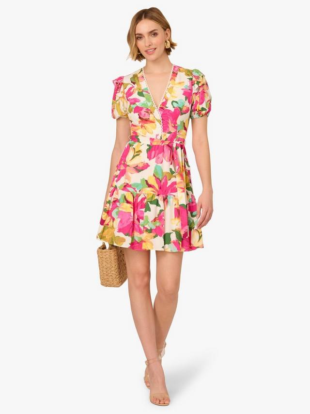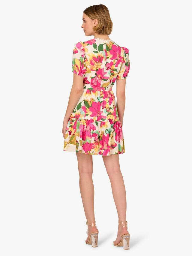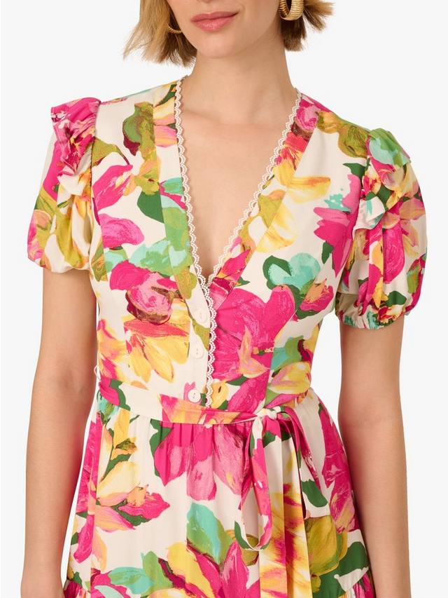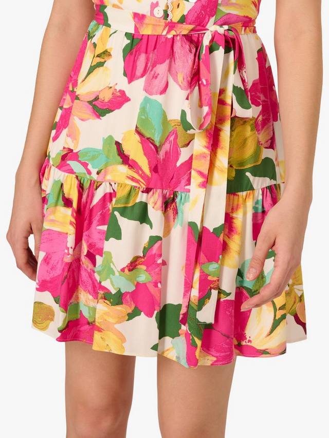 Украсьте свой гардероб этим игривым платьем из лёгкой ткани с ярким, красочным принтом. Лиф на пуговицах спереди и V-образный вырез добавляют структуру, а пышные рукава-бишоп создают лёгкий и непринуждённый образ. Талия стягивается поясом, который переходит в короткую юбку с оборкой, которая струится при каждом шаге. Собираетесь ли вы на дневную вечеринку или на выходные, это платье — идеальный баланс комфорта и солнечного стиля.