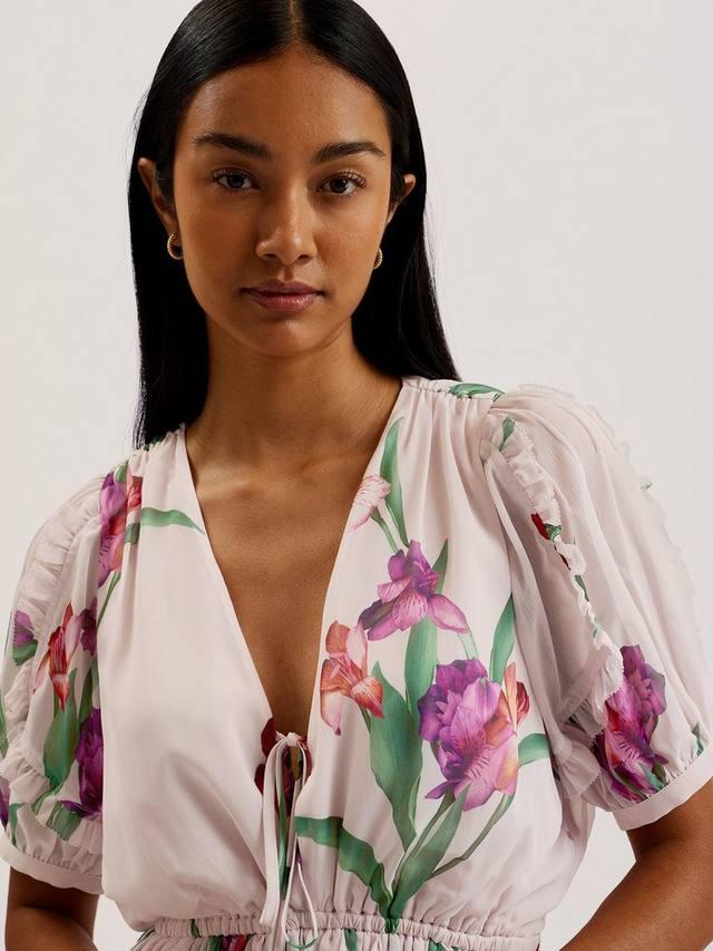 Это платье от Ted Baker, облегающее бедра, с А-силуэтом и расклешенным подолом, удобно носить. Оно выполнено из мягкого многослойного шифона с оборками. V-образный вырез, короткие рукава и цветочный принт по всей поверхности.